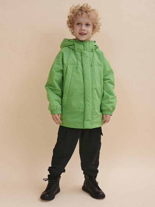Куртка детская - ветровка для мальчика с длиной до середины бедра с практичным и ловким кроем, понятной формой и силуэтом. Застегивается на молнию и дополнительно на  ветрозащитную планку с синтепоном для дополнительного тепла. Слегка спущенное плечо и углубленная пройма, мягкая линия плеча для удобства в носке.Можно вниз одеть объемное худи. Рукав объемный вверху, понизу собран на широкую резинку. Спереди - прорезные карманы на молнии. Вход в карман закрыт декоративными, наклонными, широкими планками. Капюшон с регулировкой на эластичном шнуре с фиксаторами. Сзади капюшон оформлен текстильной застежкой велькро с фиксирующим элементом - дополнительная регулировка объема и декоративный элемент. Внутренний воротник из флиса - тепло и комфортно. Объем низа изделия регулируется эластичным шнуром с пластиковыми фиксаторами.