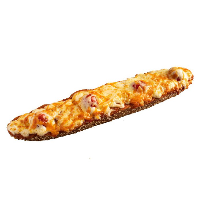 Хрустящий багет с пепперони, помидорами черри, моцареллой, чеддером и творожным сыром.