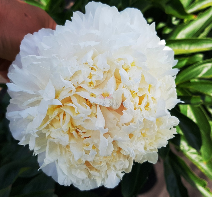 МАХРОВЫЙ бомбовидный, белый с желтыми петалодиями, диаметром 20 см, высота куста 90см, куст сильный, срок цветения средне-поздний