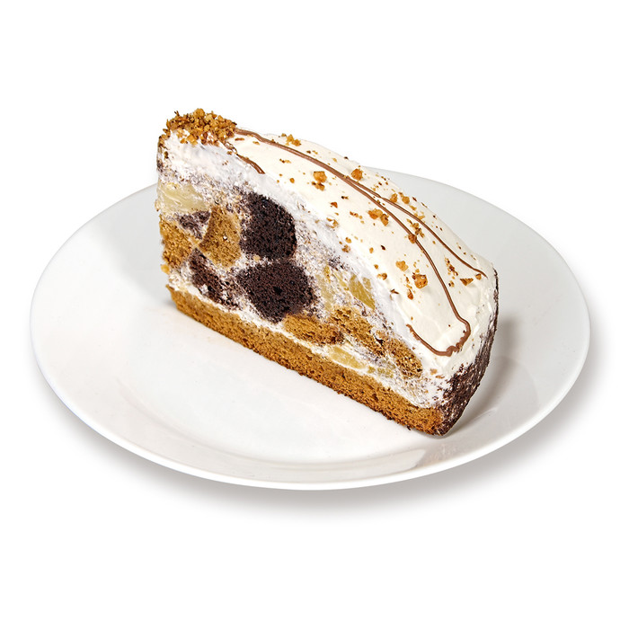 Состав: молокосодержащий продукт с заменителем молочного жира, произведенный по технологии сметаны (восстановленное молоко из сухого молока (вода, сухое обезжиренное молоко), сливочное масло, заменитель молочного жира (рафинированные дезодорированные растительные масла в натуральном и модифицированном виде, эмульгатор-моно - и диглицериды жирных кислот, антиокислитель-концентрат смеси токоферолов, краситель - бета-каротин), молочно-белковый концентрат, загустители (дикрахмалфосфат, пектин, желатин), закваска молочных микроорганизмов), сахар, крем сливочный «сливки для взбивания» ультрапастеризованные (сливки нормализованные, стабилизатор - каррагинан), мука пшеничная хлебопекарная, яйцо куриное, кефир 2,5%, ананас консервированный (кусочки ананаса, вода, сахар, регулятор кислотности: лимонная кислота), персик консервированный (персики, вода, сахар, регулятор кислотности : лимонная кислота), ядро грецкого ореха, вода, крем на растительных маслах (вода, заменитель какао нетемперируемый лауринового типа (рафинированное, дезодорированное ра стительное масло, эмульгатор соевый лецитин) сахар, молочный белок, стабилизатор Е466, эмульгатор (Е400(i), Е 472b, E472e), влагоудерживающий агент Е 420(ii), регулятор кислотности Е339 (ii), соль поваренная пищевая, ароматизатор « Сливочная ваниль»), модифицированный крахмал (холоднонабухающий крахмал из восковой кукурузы), какао – порошок алкализованный с пониженным содержанием жира, комплексная пищевая добавка-эмульгатор пастообразный ( вода, эмульгаторы Е471, Е475, сахар, влагоудерживающий агент Е1520, консервант Е202), горький шоколад (какао-тертое, сахар, какао - масло, эмульгатор (Е322-лецитины), натуральный ароматизактор (ванилин), сода пищевая, уксус, соль, сорбат калия, лимонная кислота.