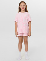 Пижама из кулирки для девочек майка + шорты. Майка на лямках, вставка и окантовка в крапинку, принт в виде медведей. Короткие шорты с аналогичным узором. Две расцветки — бежевая и розовая. Размеры от 30 до 36. Имеется возможность заказать данный товар по розничной цене.