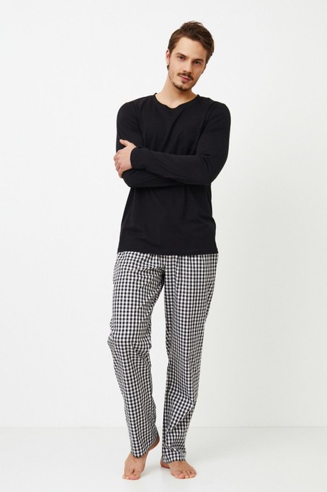 Представляем вашему вниманию пижаму Philip pajama long, которая станет идеальным выбором для комфорта вне времени. Однотонный черный топ с круглым вырезом из смеси хлопка и модала легко сочетается с классическими брюками в черно-белую клетку из хлопка с удобными карманами. У пижамной рубашки есть необычный карман с левой стороны. Он идеально подходит для хранения самых необходимых вещей, таких как мечты и устремления! А для вашей второй половинки есть пижама Philippa pajama long в тон — ведь комфортная совместная работа - это всегда беспроигрышный вариант!