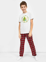 Пижама для девочки из трикотажного полотна "кулирка", состоящая из футболки и брюк. Футболка - из гладкокрашеного полотна, слега расширенная и укороченная, с втачными короткими рукавами, горловиной овальной формы, обработанной втачной планкой и принтом в центре переда, выполненным в технике шелкографии. Брюки из полотна с набивным тематическим рисунком, длинные, с эластичной тесьмой по талии и нижним срезами.