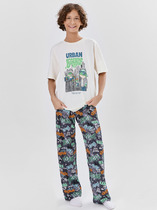 Пижама из интерлока для девочки, состоящая из джемпера и брюк. Джемпер со слегка спущенной линией плеч, с принтом на переде. Низ рукавов и брючек на манжетах.