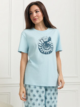 Пижама женская из гладкокрашеного трикотажного вискозного полотна с отделкой кружевом, состоящая из майки и брюк. Майка - свободного кроя, на широких двойных бретелях, с V-образным вырезом горловины. Полочка и спинка состоят из двух деталей с отрезной кружевной кокеткой. Проймы окантованы основным материалом.Брюки – свободные, средней длины, слегка зауженные книзу, с эластичной тесьмой по талии.
