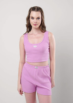 Пижама молодежная из трикотажного полотна «кашкорсе» с набивным рисунком состоящая из майки-топа и шорт. Футболка – полуприлегающего силуэта, с короткими втачными рукавами, горловиной овальной формы, окантованной основным материалом. По горловине выполнена декоративная строчка «кроше» контрастными нитками. Нижний срез рукавов и низ изделия обработаны узкой обметочной, создающей красивый волнистый край.Шорты - укороченные, расширенные книзу, с эластичной тесьмой по талии. Нижние срезы шорт обработаны узкой обметочной строчкой контрастного цвета, создающей красивый волнистый край.