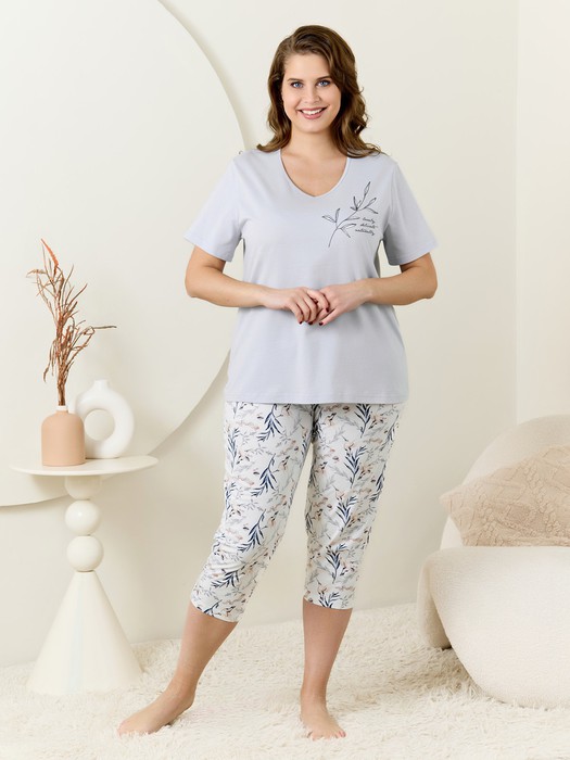 Пижама женская из трикотажного полотна «кулирка» в комбинации двух видов полотен: гладкокрашенного и с набивным рисунком, состоящая из футболки и бриджей. Футболка – из гладкокрашенного полотна, классического покроя, с короткими втачными рукавами, горловиной V-образной формы, окантованной основным материалом и принтом на полочке, выполненным в технике шелкографии.Бриджи – из полотна с набивным рисунком, свободного покроя, на притачном поясе с эластичной тесьмой внутри.