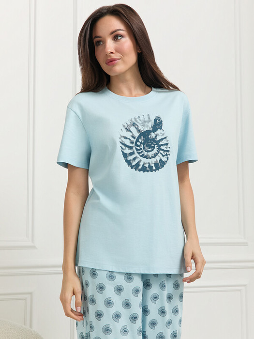 Женская пижама с трендовым принтом: классическая футболка с коротким рукавом и круглым вырезом, а также прямые брюки с карманами и поясом на резинке.