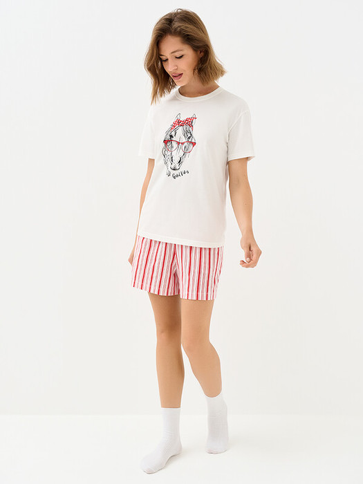 Женская пижама с трендовым принтом: футболка прямого кроя с круглым вырезом и короткими рукавами, а также свободные шорты с удобными карманами и поясом на резинке.Изготовлена из 100% мягкого, гребенного хлопка, который отлично пропускает воздух, приятно ощущается на теле и подходит даже для самой чувствительной кожи.