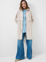 Укороченный плащ  прямого силуэта с рукавами покроя реглан и застежкой на двухзамковую молнию, позволяющую регулировать ширину шага, подходит для девушек и женщин разного возраста. Воротник - стойка, переходящая в капюшон. Вместительные карманы удобно расположены между рельефных швов. Есть внутренний кармашек на молнии.  Силуэт плаща можно менять с помощью затяжек по линии талии (со стороны спинки) и по линии низа. Подкладка в изделии выполнена из ткани в мелкую полоску. Этот весенний плащ из хлопкосодержащей ткани с водоотталкивающей пропиткой хорошо садится на любую фигуру. Добавьте яркости в аксессуарах, и Ваша весна будет комфортной и стильной!