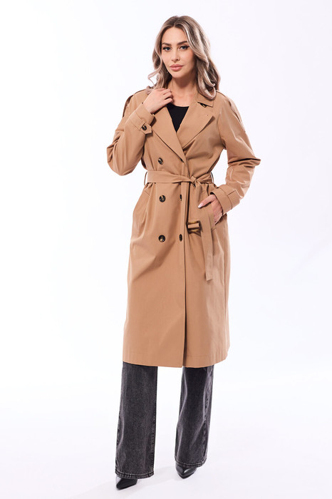 Плащ с центральной двубортной застежкой на петли и пуговицы, отложным воротником и лацканами. По переду с прорезными карманами с листочками. Спинка со средним швом, заканчивающимся шлицей, отлетной кокеткой. На плечах и по низу рукавов- паты, зафиксированные шлевками и петлями с пуговицами. Рукав- реглан. Плащ со съемным поясом.