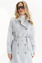 Плащ женский полуприлегающего силуэта предназначен для повседневной носки. Перед с двумя нагрудными вытачками, с двумя отрезными бочками, в швах их соединения с передом обработаны карманы. Спинка со средним швом, заканчивающимся шлицей. Горловина круглая, с втачным воротником с отрезной стойкой. Застежка центральная двубортная на 14 пробивных металлических кнопок. Рукав втачной, двухшовный, длинный, низ рукава с тремя настрочными шлевками, в которых держится хлястик из отделочной ткани, закрепленный в пряжку. Плащ с плечевыми накладками. Плащ на притачной подкладке по низу. К плащу прилагается съёмный пояс из отделочной ткани с пряжкой. Плащ со съемным жилетом, длиной до линии лопаток. Перед с нагрудными вытачками и одним настрочным прямоугольным клапаном слева. Спинка цельнокроеная. Горловина, проймы и низ обтачные. Жилет на подкладке без застежки. К плащу крепится на пуговицу на горловине спинке плаща под воротником. Длина плаща 116 см. Длина рукава 61 см. Длина жилета 36 см