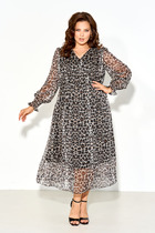 Платье приталенного фасона. На талии установлены шлефки на пуговицах, в который продет пояс. Короткий рукав, отложной воротник. Рукава декорированы патами. Застегивается на пуговицы. В области груди имитация карманов. По бокам накладные карманы.