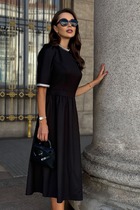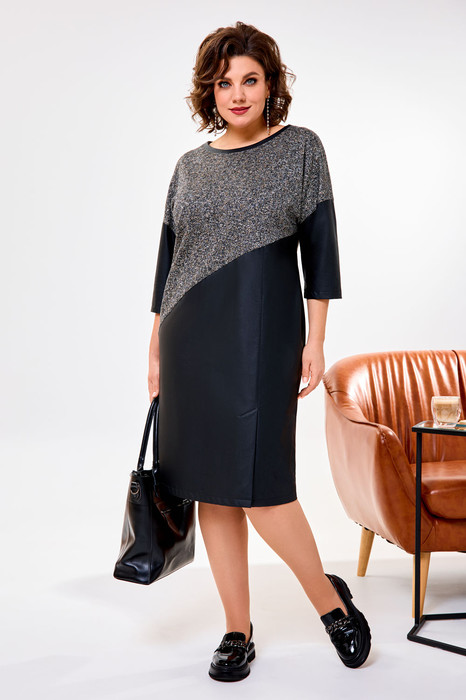 Стильной женское платье, верх выполнен из высококачественного трикотажа с добавлением вискозы, низ платья, рукава и отделка по горловине из высококачественной эко-кожи на хлопковой основе. Горловина платья округлая, рукав платья 3/4, спущенный. Юбка платья по переду со шлицей. Модель стильная и практичная, невероятно стройнит, прекрасно подойдет для ежедневной носки и торжественного мероприятия, вы будете выглядеть современно и неотразимо.