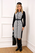 Стильное женское платье, выполнено из двух видов ткани — костюмно-плательная ткань, с добавлением вискозы и модным принтом черно-белая гусиная лапка и отделкой из черного трикотажа премиум качества. За счет комбинирования двух видов ткани, платье невероятно стройнит и вытягивает силуэт на фигуре. Платье по переду с застежкой на молнию (длина молнии 100 см). Горловина платья и манжета рукава с отделкой из трикотажного довяза, что придает модели особый шарм. Рукав платья полной длины. Платье без подкладки. В комплекте идет съемный кожаный пояс, который прекрасно дополняет полный образ платья.