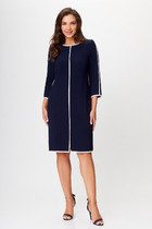 Платье женское А- образного силуэта, с застёжкой смещенной влево по притачной планке на петли, пуговицы, по линии талии правой стороны кулиса с завязкой и фиксаторами фиксируемая степень прилегания и баска переходящая в мягкую драпировку по левому боковому, с разноуровневым низом. Перед с нагрудными выточками. Спинка со средним швом и отлетной кокеткой верху по левой части. Рукава втачные, одношовные, длинные понизу с разрезом, сборкой и притачными манжетами на петлю и пуговицу. Воротник стояче-отложной на отрезной стойке застёгивающаяся на петлю и пуговицу.