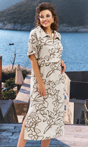 Платье женское полуприлегающего силуэта, с застёжкой на потайную молнию по среднему шву спинки. Перед с нагрудными и талевыми выточками. Спинка с талевыми выточками, средний шов заканчивающийся шлицей. Рукава втачные, одношовные, короткие.