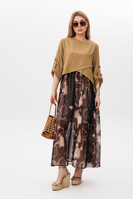 Платье макси комбинированное, двухцветное. Лиф ассиметричный по низу, с имитацией запаха. Вырез горловины полукруглый, по спинке затежка на молнию. Рукава втачные, с манжетами и патами. Юбка на резинке, драпирующаяся, на подкладке, расширенного силуэта. Талия на резинке.