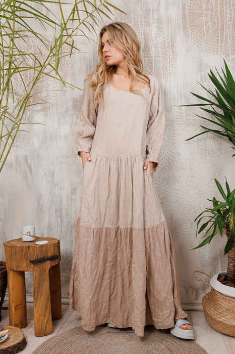 Притягательное в своей натуральности льняное платье  "АМУЛЕТ". В швах удобные карманы, по юбке два ряда валанов , на кукавах маленькие складочки.  Все изделия коллекции "АМУЛЕТ" имеют натуральную ткань, сложную обработку всех внутренних швов и  энергосберегающий крой. В подарок идет шопер с логотипом бренда.