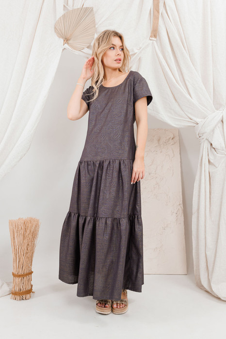 Очень красивая ткань -  иммитация льна с легчайшим золотистым блеском. Платье   с  сильно  заниженной трендовой  талией и двумя  воланами по нзу.  Подкладки нет.