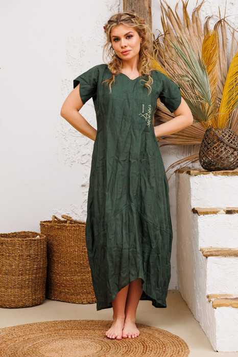 Платье колокольчик с ассиметричнымнакладным  карманом на грудина на котором вышита руна "ЗОЛОТОЙ ДРАКОН". Она олицетворяет удачу и достаток, успех во всех начинаниях и радость в воплощении задуманного. в этом платье ВСЁ легко решается, достигается и получается! Низ юбки и рукавчики имеют красивые вырезы уголками. Платья бренда АМУЛЕТ создаются по  славянским законам энергообережной одежды. Имеют перекидной крой и  нет швов по главным энергоцентрам человека и они все пошиты закрытым способом по изнанке платья. используется только натуральная ткань и фурнитура. В подарок   платье упаковывается в шопер с символом бренда.