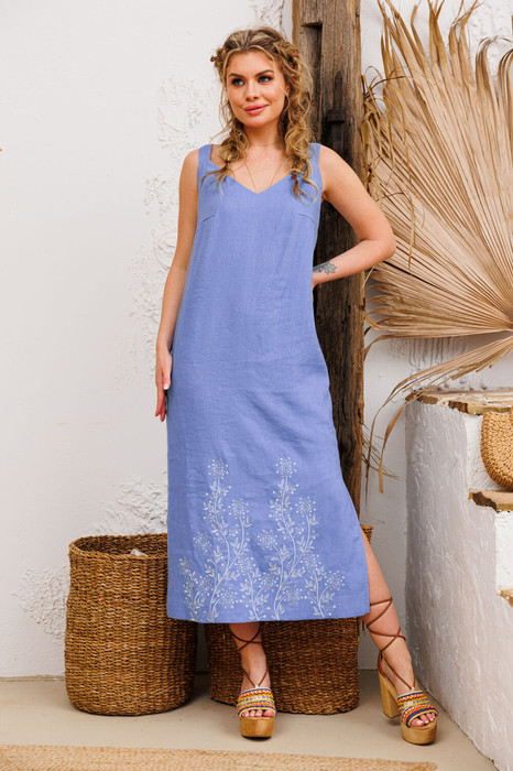 Сарафан из натуральной ткани с дизайнерской вышивкой по низу переда. В боковом шве разрез. По спинке средний шов, молния и талиевые выточки.