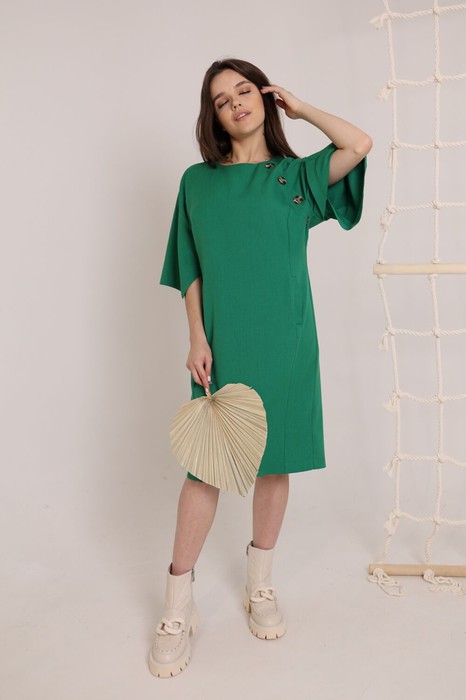 Яркий образ женского платья будет привлекать внимание окружающих.По спинке изделия застёжка-молния и разрез. По переду  полукруглый вырез горловины,рельефные линии от проймы. Действующие карманы . Необычный рукав даёт свободу движения. Платье на любой сезон.