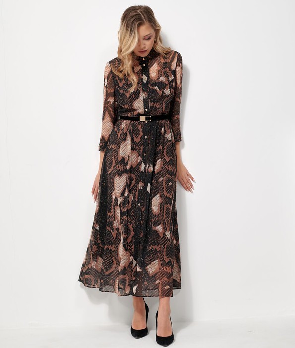 Платье полуприлегающего силуэта, слегка расширенное к низу из шифоновой ткани на подкладке длинной макси будет незаменимо в теплые весенние дни. Горловина обработана стойкой, застежка центральная на притачных планках застегивающаяся на петли и пуговицы. Рукав втачной длинно 7/8 по низу притачная манжета с декоративной пряжкой. Платье отрезное по линии талии, по полочке кокетка в шов притачивания которой вставлен клапан. Платье дополнено съемным ремешком.