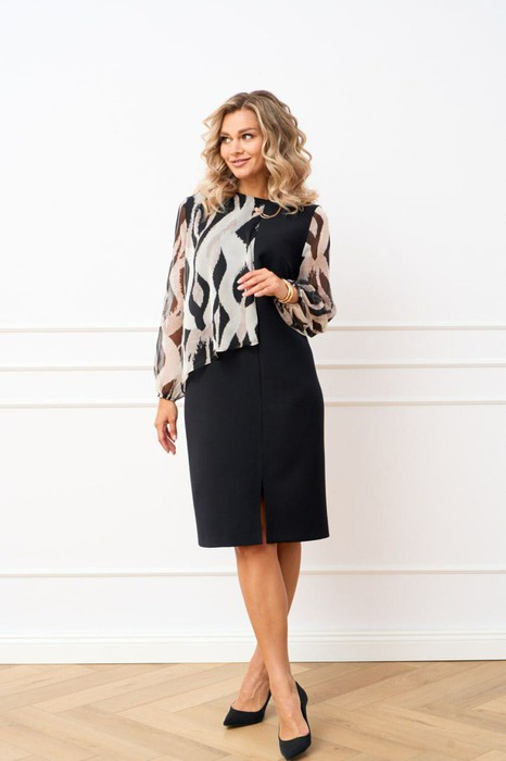 Платье комбинированное из шифона и костюмно-плательной ткани полуприлегающего силуэта. По полочке обработаны нагрудные выточки, также вставлена декоративная деталь из шифона по правое стороне входящая в подрез, который переходит на левую сторону по низу обработан разрез. Спинка со средним швом в котором обработана застежка на потайную тесьму молнию. Вырез горловины фигурный. Рукава длинные втачные из шифона по низу собраны на эластичную тесьму.