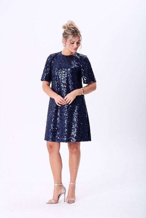 Платье из ткани в пайетки А-силуэта, длинной чуть ниже колена. Вырез горловины круглый по спинке для удобства обработана капелька, застегивающаяся на петлю и пуговицу, спинка со средним швом. Рукав короткий слегка расширенный к низу.