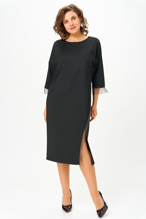 Черное платье миди — не просто одежда, это заявление о вашем стиле и вкусе. Элегантное  праздничное платье прямного силуэта из трикотажного полотна.  Ткань не мнется.   Благодаря своему крою подойдёт для разных типов фигуры. Оно подчеркнёт вашу индивидуальность и станет отличным дополнением к вашему  гардеробу. В нём вы будете чувствовать себя уверенно и комфортно, зная, что выглядите на все сто. Выбирая его, вы выбираете качество, комфорт и стиль. Классическое черное платье прямого силуэта,  со спущенным плечом. По переду идет подрез с разрезом. В качестве декора по подрезу и низу рукава- металлизированная бахрома. По спинке идет средний шов. Такое платье незаменимая вещь в любом гардеробе. Рекомендуется носить на черное белье. Длина платья по спинке (48-52) - 108см, (54-58) - 112 см. Длина рукава: (48-58) - 24 см.