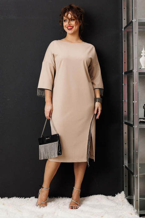 Платье миди — не просто одежда, это заявление о вашем стиле и вкусе. Элегантное праздничное платье прямного силуэта из трикотажного полотна. Ткань не мнется. Благодаря своему крою подойдёт для разных типов фигуры. Оно подчеркнёт вашу индивидуальность и станет отличным дополнением к вашему гардеробу. В нём вы будете чувствовать себя уверенно и комфортно, зная, что выглядите на все сто. Выбирая его, вы выбираете качество, комфорт и стиль. Классическое черное платье прямого силуэта, со спущенным плечом. По переду идет подрез с разрезом. В качестве декора по подрезу и низу рукава- металлизированная бахрома. По спинке идет средний шов. Такое платье незаменимая вещь в любом гардеробе. Рекомендуется носить на черное белье. Длина платья по спинке (48-52) - 108см, (54-58) - 112 см. Длина рукава: (48-58) - 24 см.