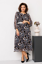 Полочка платья с центральным швом, в верхней части которого выполнена оригинальная застежка на петли и пуговицы, в нижней части центрального шва полочки обработана шлица. Полочка с нагрудными вытачками. Горловина круглой формы с воротником рубашечного типа. Спинка со средним швом.  Рукав втачной, одношовный, длинный, по низу со складкой и притачной манжетой. Манжета с разрезом по низу и декором из пуговиц.