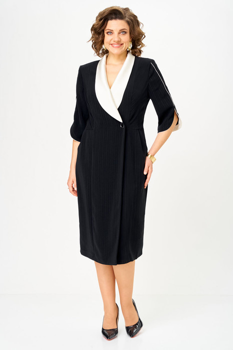 Полочка платья с вертикальными рельефами в верхней части и с отрезной боковой нижней частью, на которой выполнены   карманы и складки в шве по талии.  Застежка двубортная, на петлю и пуговицу. Горловина V-образной формы, обработана воротником типа “апаш” из отделочной ткани.  Спинка со средним швом и вертикальными рельефами. Рукав длинной 3/4, втачной, двухшовный, с отделкой по краю.