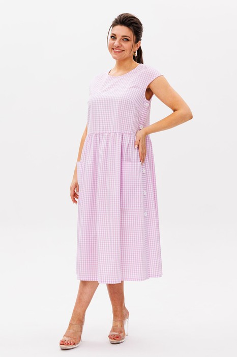 Отрезной крой по талии деликатно подчеркивает силуэт, а декоративные петли с пуговицами по бокам придают платью изящную деталь, делая его интереснее. Воздушная миди-длина удобна для прогулок и отдыха, а натуральная ткань позволяет коже дышать даже в самый теплый день.