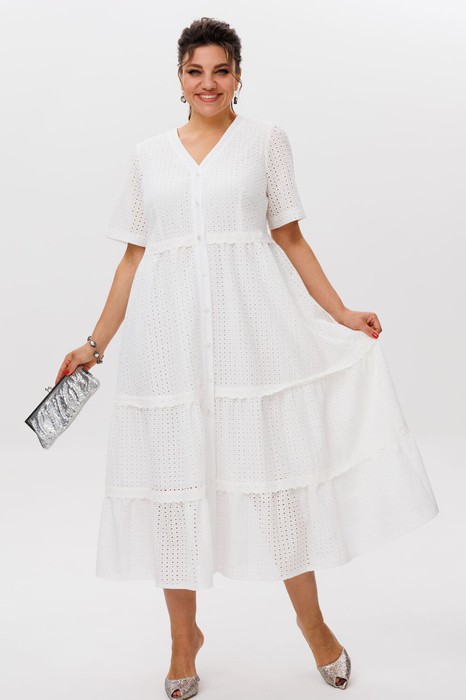 Воздушное шитье, напоминающее искусную ручную работу, создает на белоснежной ткани изысканный кружевной узор, который делает этот образ безупречно нежным. V-образный вырез подчеркивает изящество линий, а короткий рукав со сборкой дарит образу трогательную романтичность. Расширенный к низу А-силуэт с летящими воланами и изящная застежка на маленькие пуговички дарят этому наряду особенную, женственную грацию. На подкладке платье сидит безупречно, даря комфорт и уверенность, позволяя вам чувствовать себя настоящей королевой.