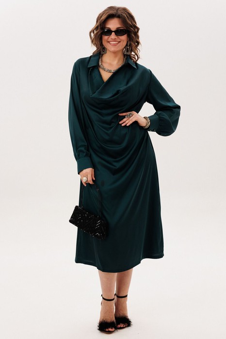 Платье от Анелли из струящегося армани шелка в цвете «глубоководный зеленый» обретает благородную мягкость в полуприлегающем силуэте, который чутко следует за линией тела.