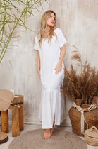 Платье из легкой ткани Шифон,  отрезное по линии талии. Округлый воротник-стойка. Застежка молния в боковом шве. Дополнено съемным поясом. Рукава реглан.  Длина платья: 110 Длина рукава: 47 см. Полуобхват талии – 49 см.