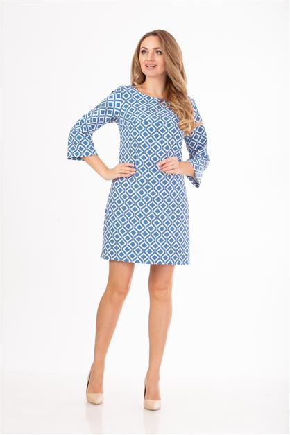 Платье длиной выше колена, с геометрическим принтом, молочного и голубого оттенков с принтом «девочка с зонтиком». А-образного силуэта.