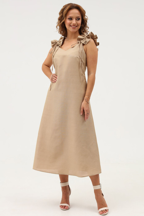 Платье полуприлегающее А-силуэта с тонкими бретелями на завязках. Горловина по переду V-образной формы. По переду нагрудные вытачки, а спинка - с рельефами. Застежка на потайную молнию в боковом шве. В комплекте съемные рюши на бретели из основной ткани.
