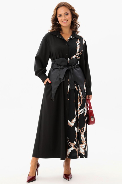 Платье А-силуэта длиной макси. Воротник рубашечного типа - отложной на отрезной стойке. По переду расположена центральная застежка на кнопки. Спинка со средним швом. В боковых швах обработаны функциональные карманы. Рукав втачной прямой длинный, со спущенной линией плеча, по низу на манжете с застежкой на кнопки.