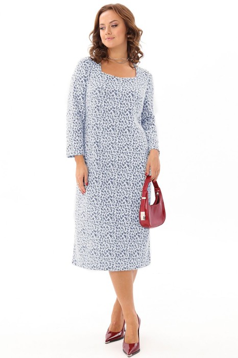 Платье прямого силуэта длиной миди. Горловина с вырезом "каре". По переду платья нагрудные вытачки. В боковых швах обработаны разрезы. Рукав втачной прямой длиной 7/8.