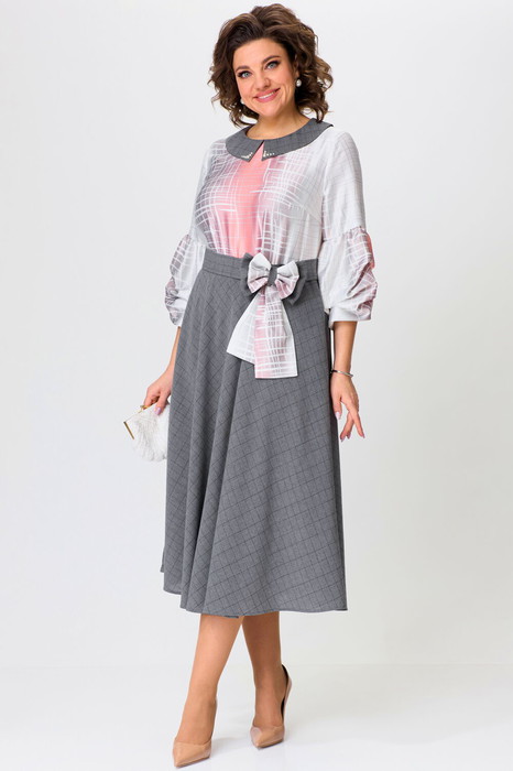 Платье из двух видов ткани полуприлегающего силуэта, расклешенное книзу. Воротник отложной плосколежащий, декорирован бусинами. Платье отрезное по линии талии. По переду обработаны нагрудные вытачки. Спинка с застежкой молнией в среднем шве. Рукав втачной длинной 3/4, на резинке понизу, с горизонтальным подрезом и с защипами. В боковых швах расположены карманы.  Особый шарм платью придаст пояс из основной ткани, декорированный бантом.