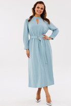 Платье приталенного силуэта, чуть ниже колена из костюмно-плательной ткани. Вырез горловины квадратной формы. Отрезное по линии талии. Перед и спинка с рельефами. По спинке средний шов, в котором вставлена потайная молния, внизу разрез. Рукав втачной широкий длинный, по окату собран на резинку. Длинный рукав легко превратить в три четверти с помощью резинки, вставленной по низу рукава. В комплект входит пояс из основной ткани.