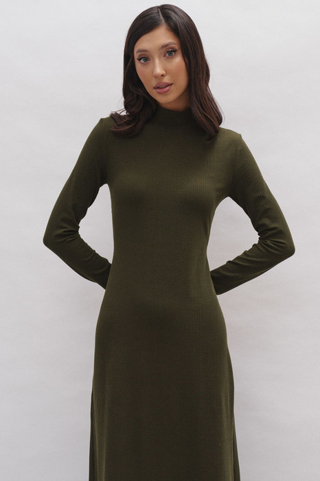 Платье А образного силуэта выполнено из трикотажного полотна в рубчик цвета хаки. Уютное, женственное, универсальное платье лучший вариант осеннего образа. Характеристики: А образный силуэт, горловина стойка, рукав втачной. Длина изделия 134 см, длина рукава 64 см.