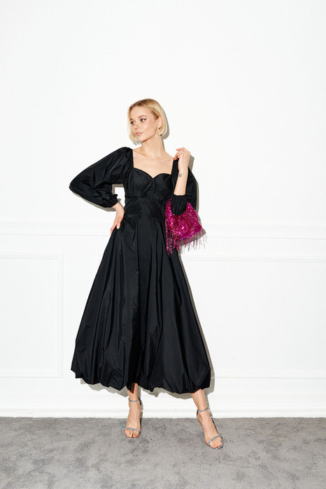 Платье полуприлегающего силуэта выполнено из плотного полотна с блеском черного цвета. Идеальный вариант платья для создания вечернего образа. Характеристики: полуприлегающий силуэт, подкладка, отрезное, отрез - стабильная вставка, фигурный вырез горловины, по переду функциональные пуговички, рукава объёмные верх и низ рукава на резинки, рукава могут быть спущены на плечи, застежка потайная тесьма молния в среднем шве заднего полотна, юбка в изделии свободного кроя с подгибом на резинке. Длина от плеча 127 см, длина рукава 61 см.