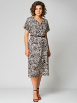 Платье свободного кроя выполнено из полотна с принтом - на белом фоне черными линиями мопсы. Характеристики: прямой свободный крой, подкладка, отрезное, отрез на кулиске, воротник отложной, застежка центральная на петли пуговички, рукав втачной, по низу изделия нашит волан. Длина по спинке 127 см, длина рукава 19 см.