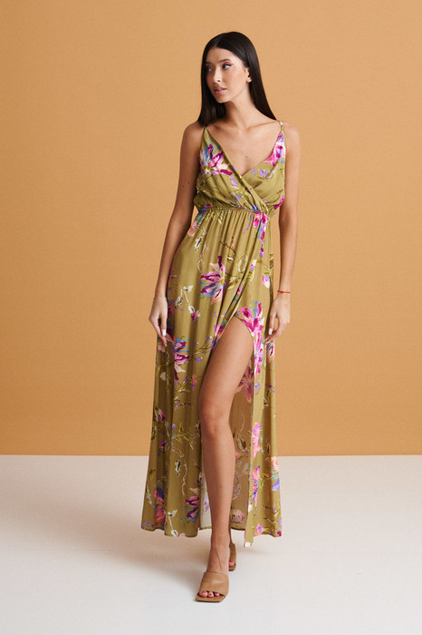 Платье полуприлегающего силуэта выполнено из струящегося полотна с цветочным принтом. Характеристики: полуприлегающий силуэт, отрезное, отрез на резинке, горловина V образный силуэт на запах, бретели регулируемые, низ изделия выполнен на запах. Длина по спинке 135 см.