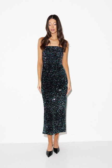Платье прилегающего силуэта с открытыми плечами выполнено из полотна с пайетками. Характеристики: прилегающий силуэт, подкладка, открытые плечи, верх изделия на резинке. В среднем шве заднего полотна изделия разрез 48 см. Длина изделия 112 см.