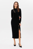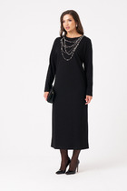 Платье-мини приталенного силуэта. Выполнено из мягкого плотного трикотажа чёрного цвета. Декорировано бантом из хлопка чёрного цвета (съёмный на булавке). Одно плечо открыто. Застёжки в изделии нет. Длина от плеча 85 см, длина по боковому шву 64 см